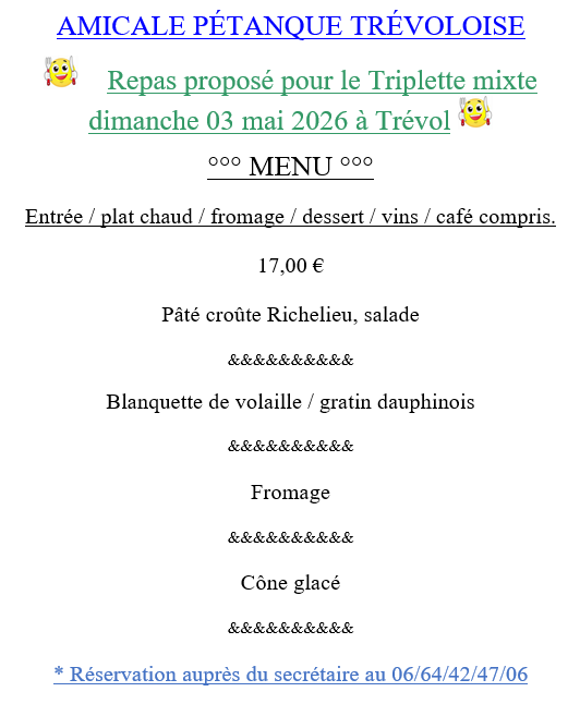 A l'occasion du Championnat Doublette Mixte, le 19 avril, la Pétanque Cressangeoise vous propose une restauration sur place à 18€ (→ Voir affiche du menu)Réservation sur place ou par téléphone : 06.24.85.24.69