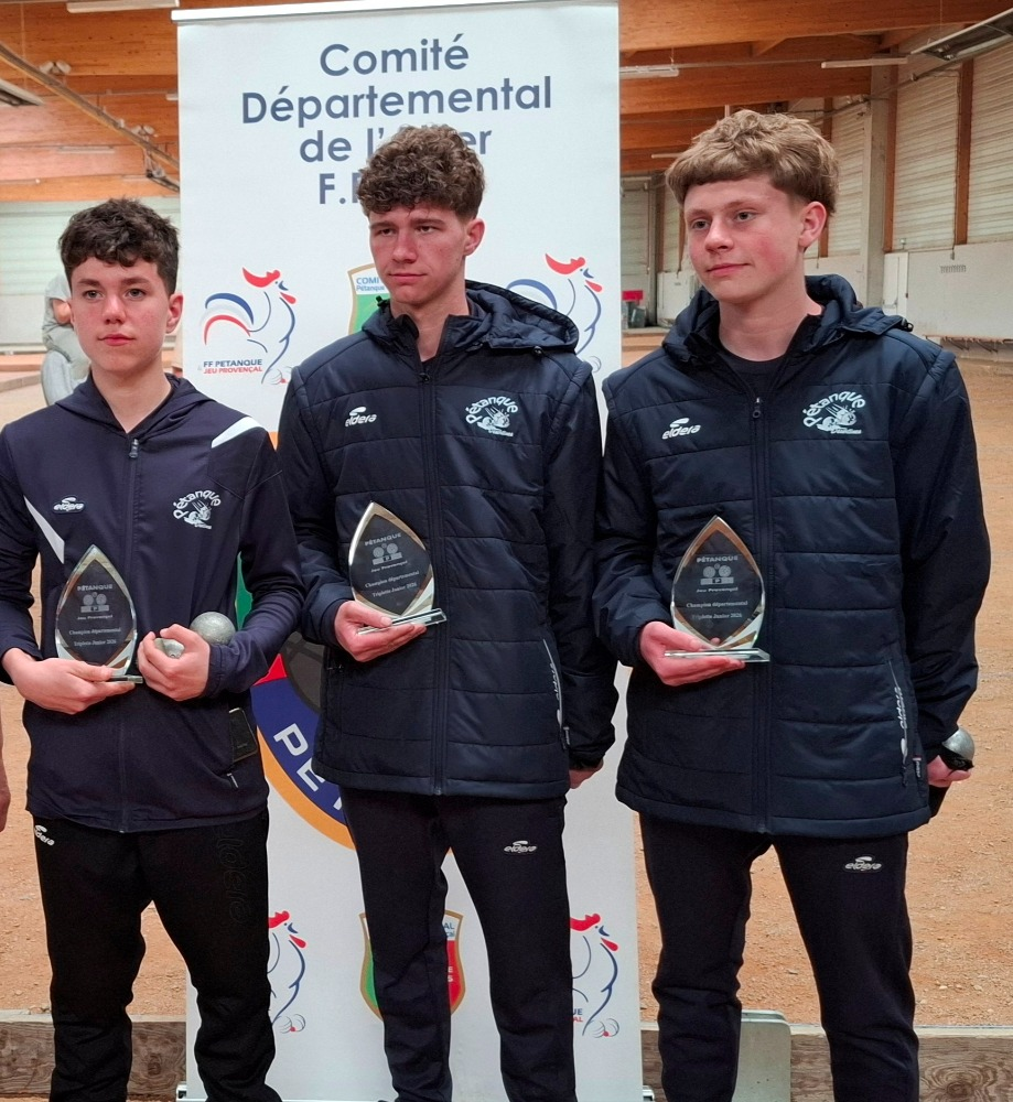 DUBOST Enzo, MATZ Arnaud et DUBOST Gaëtan de Malicorne Pétanque. Un long week-end qui leur permet de décrocher le titre.