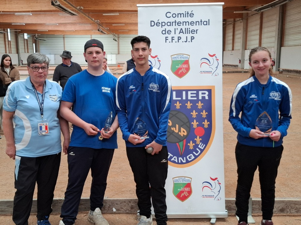 Medhi MULLER (Pétanque Lurcyquoise), Louise LACHAUD (A.S. MERCY Pétanque), Kaïs GOMES-DUARTE (Pétanque Moulinoise).